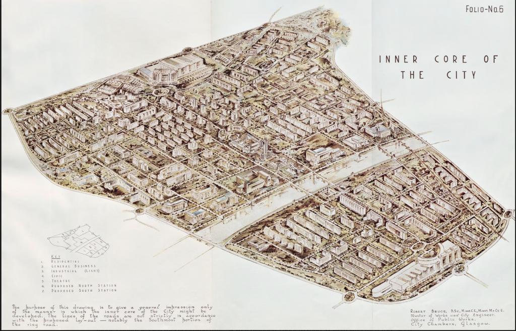 The original plans for the Glasgow Inner Ring Road we originally published in 1945, but a hint of the controversy to come was also noted: The City Engineer, Robert Bruce acknowledged that people might think the necessary demolition for these improvements “drastic” but they should measured this against the importance and long-life of the overall objectives. However, the First Planning Report is often remembered for its proposals for the redevelopment of the city centre. Glasgow’s familiar grid system would be retained but all existing buildings would be demolished. The completion of the Glasgow Inner Ring Road was finally squashed in 1975 by the new Strathclyde Regional Council.