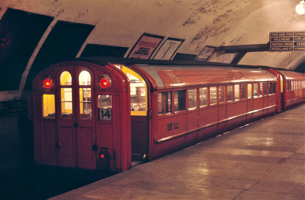 Norrie also mentioned a 1975 picture of Glasgow underground taken by an American student. In a 2017 exhibition one chap was recognised and identified, a copy of the picture is now with his grandson. This is not the picture, but this is a train of the times.