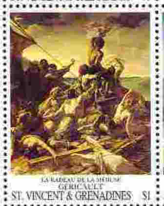 Dozens were washed into the sea by a storm, while others, drunk from wine, rebelled and were killed by officers. When supplies ran low, several of the injured were thrown into the sea, and some of the survivors resorted to the Custom of the Sea, engaging in cannibalism. Seventeen days later 15 survivors, all that remained of the 147, were rescued by the brig Argus, which encountered them after sailing from St. Louis to search for the raft. The design of the stamp is based on an oil Painting by Jean Louis Audie Theodore Gericault, painted in 1818-19 and depicts the sighting of the Argus by the survivors on the raft.