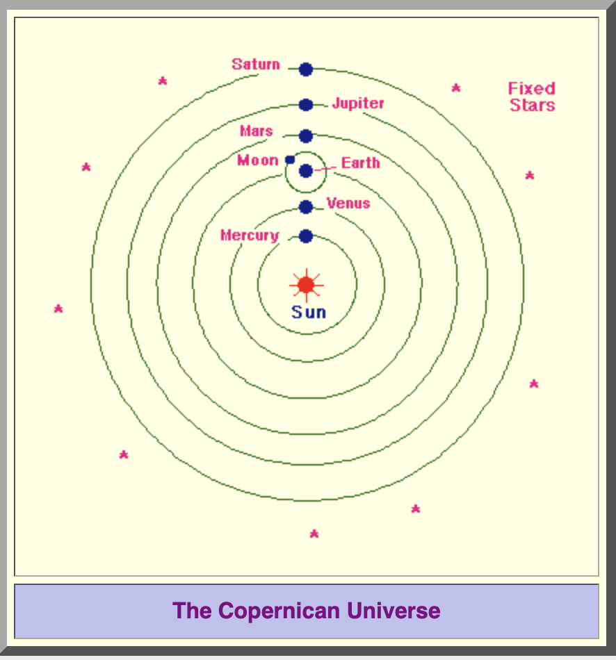 In the 1500s Copernicus proposed a Heliocentric system, with the sun in the centre, the earth orbiting the sun and the moon in turn orbiting earth; it still had fixed stars: